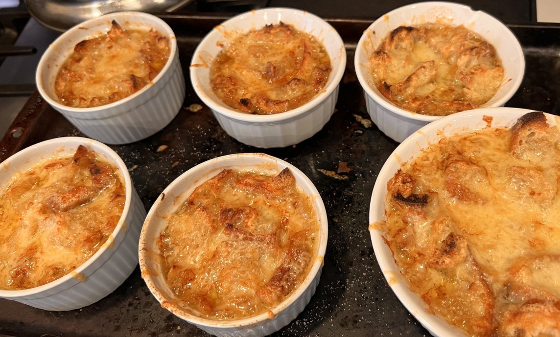 - Ladle the soup into oven-safe crocks on a sheet pan. Cover each with the toasted bread, then a handful of grated cheese. Place under your oven’s broiler until the cheese is melty and golden brown.