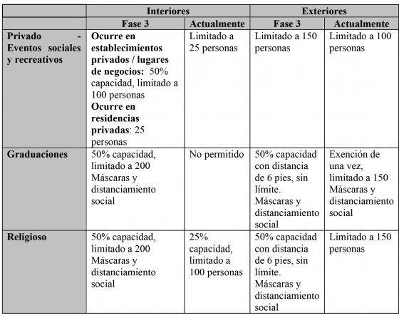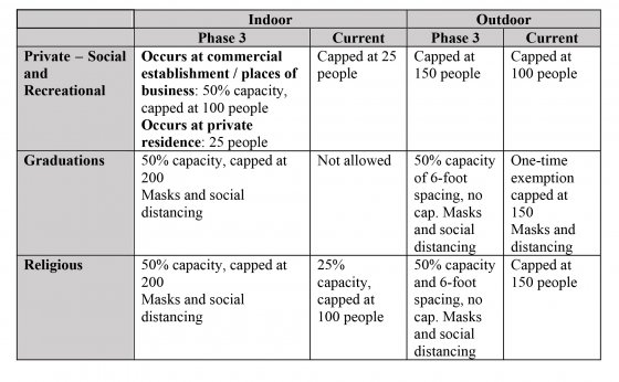 - Outdoor event venues (e.g. amphitheaters, race tracks, etc.) will increase from 25 percent to 50 percent capacity with masks and social distancing requirements;