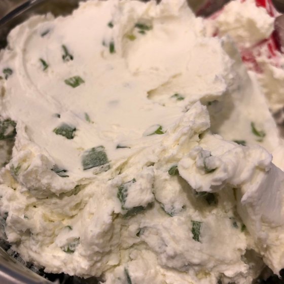 - Misture o requeijão, as cebolinhas e as pimentas jalapeños num batedor elétrico ou a mão. Tempere a gosto.
