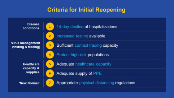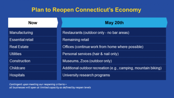 El 30 de abril, durante su rueda de prensa diaria, el gobernador Lamont presentó un enfoque que su administración está considerando para reabrir la economía de Connecticut en fases que comenzarán el 20 de mayo de 2020.