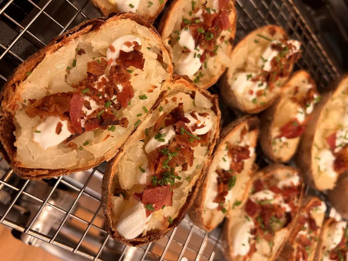 - Quando o forno estiver pronto, ponha as batatas diretamente na grade. Dependendo do tamanho, pode levar de 1 a 2 horas.